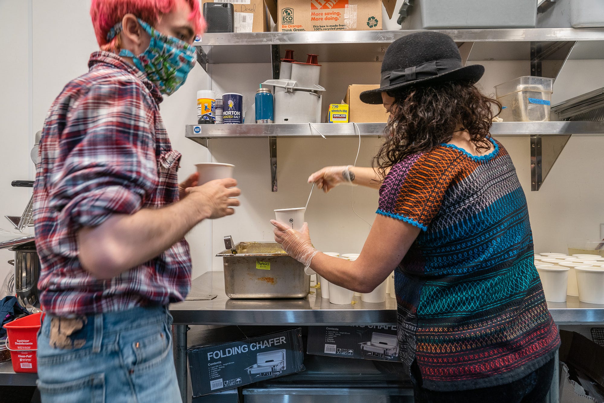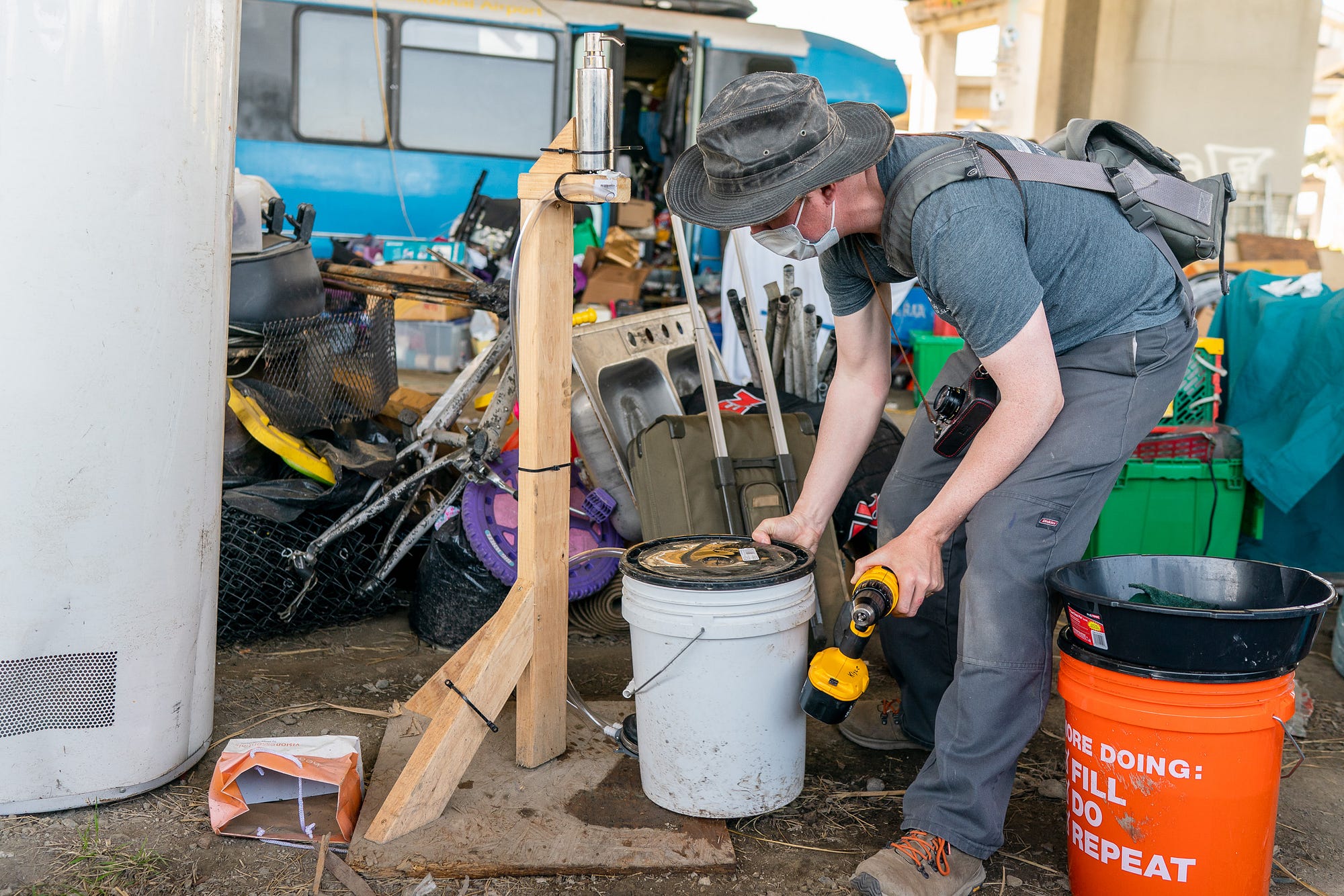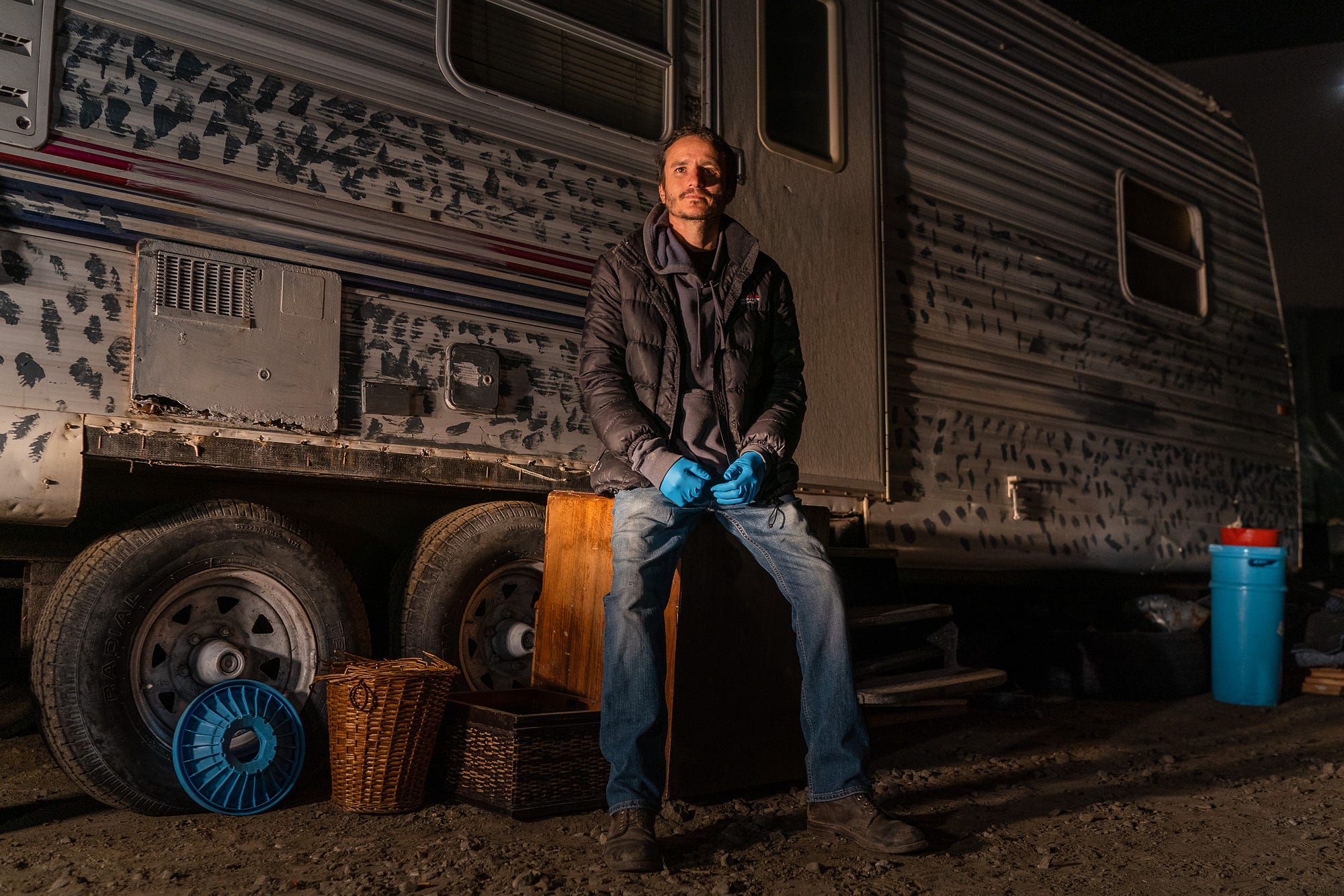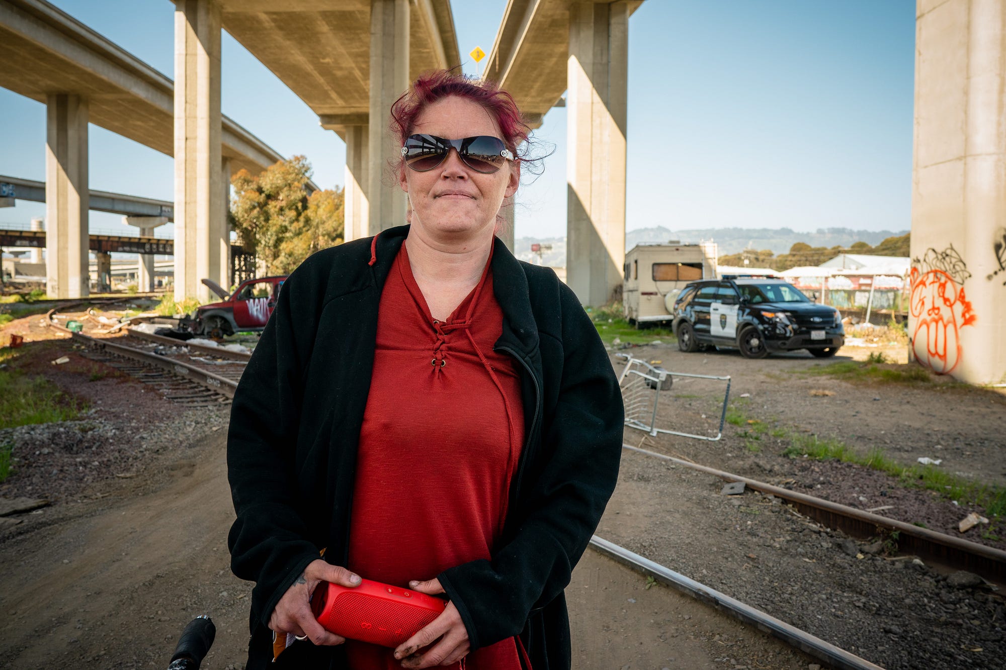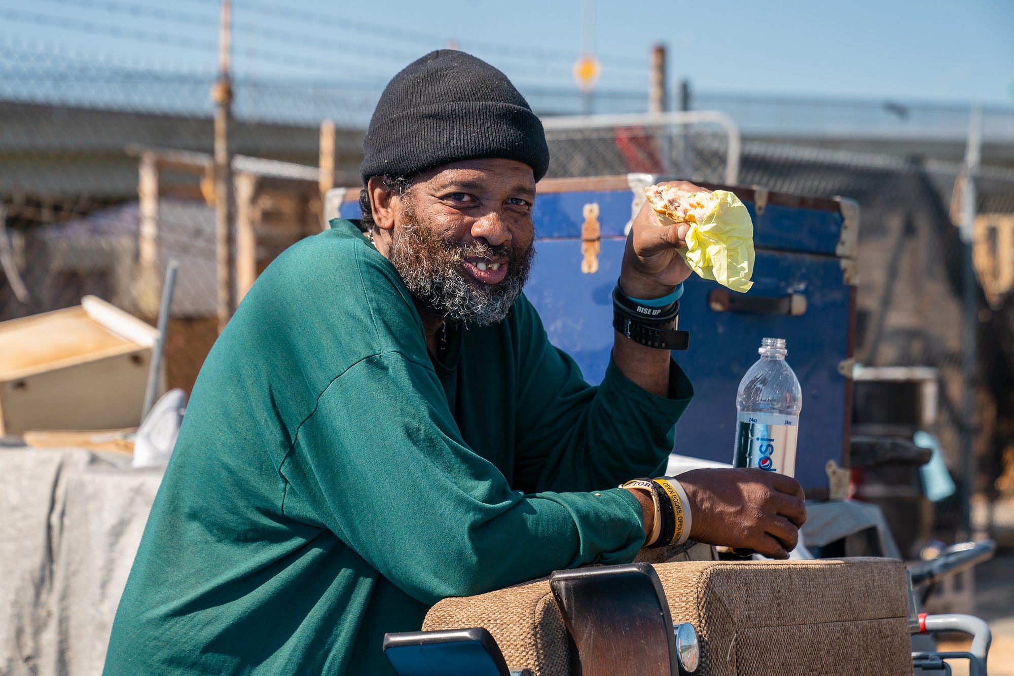 The streets are quiet and nearly empty in the SOMA neighborhood of San Francisco on the evening of March 20. Six Bay Area counties including San Francisco County issued shelter-in-place orders that began March 17.Larry, a resident of the Wood Street Collective, poses for a photo while eating lunch in Oakland on April 12.Members of the United Front Against Displacement host a weekly community meeting for residents of the Wood Street Collective in Oakland. The group has been working with residents to understand their needs to provide support and essential services not provided by the city.Left: A protestor urges San Francisco Mayor London Breed to provide shelter for homeless people in vacant hotel rooms, leading chants from their car outside the Moscone Center homeless shelter in San Francisco on April 3. Right: Signs on the windows of the Multi-Service Center South homeless shelter inform people that one-night reservations are no longer available due to Covid-19. Three days later, 68 long-term residents at the shelter and two staff members tested positive for Covid-19. The most recent report puts those numbers at 96 residents and 10 staff. Homeless advocates have called for the city to house homeless residents in hotels during the pandemic to avoid the spread.Floor mats and pillows for homeless people fill one of the halls at Moscone West shelter in San Francisco. The city said it would use the convention center and other designated locations as temporary shelters but later revised its plans after backlash from homeless advocates who said the layout of the rooms didn’t allow for proper social distancing.Dayton Andrews, an activist with the United Front Against Displacement, holds face masks to distribute to residents of the Wood Street Collective in Oakland.Portland (left) and Xochitl Bernadette Moreno prepare soup for residents of Wood Street at Restore Kitchen in Oakland.Volunteers bottle homemade hand sanitizer to be distributed to homeless residents in Oakland. Many people experiencing homelessness don’t have access to running water or the ability to wash their hands regularly. The Centers for Disease Control and Prevention recommends both handwashing and using hand sanitizer to help prevent the spread of Covid-19.Dayton Andrews (left) serves food to a Wood Street resident with the help of Dale Smith (right) in Oakland. The United Front Against Displacement serves residents meals to take back to their tents and vehicles several times a week.Bacon (foreground) and another dog play in the afternoon sun at the Wood Street Collective in Oakland. The United Front Against Displacement also provides food for residents’ pets.Wood Street resident Amanda stands in front of an Oakland Police Department vehicle parked within the Wood Street Collective in Oakland. Residents have complained about increased police presence since the shelter-in-place order went into effect.Homeless residents and members of the United Front Against Displacement protest in front of Oakland Mayor Libby Schaaf’s house. The group’s demands include services and support for homeless people and an end to police harassment.Christin Evans with Homeless Youth Alliance unboxes donated tents inside her garage in San Francisco. Evans and other homeless advocates solicited the donations on Twitter and have received as many as 40 tents in a single day. Tents are distributed to homeless residents across the city in collaboration with several outreach organizations.Supplies for a temporary homeless shelter at Moscone West are pictured in the hallway of the convention center in San Francisco.Xochitl Bernadette Moreno carries a box of supplies for providing homeless people with meals in Oakland. Moreno is a member of Essential Food and Medicine and works with multiple organizations to feed people in need throughout the East Bay.Volunteers build handwashing stations for homeless people in Oakland.An activist performs maintenance on a handwashing station after receiving feedback from a Wood Street resident. This is the fourth generation of handwashing stations that the United Front Against Displacement has built for residents.Ben and Cassidy of the United Front Against Displacement walk through the Wood Street Collective while checking in with residents.Tony Fuentes Diaz, 40, sits in front of his RV with light from his truck headlights at the Wood Street Collective. Diaz is a trained solar technician and is planning to build a solar power station for all residents to use because the city doesn’t provide sanctioned electrical service to the community.A sign in the windows of Multi-Service Center South, the largest homeless shelter in San Francisco, offers a positive message. Nearly 100 residents of the shelter and 10 staff members have tested positive for Covid-19.