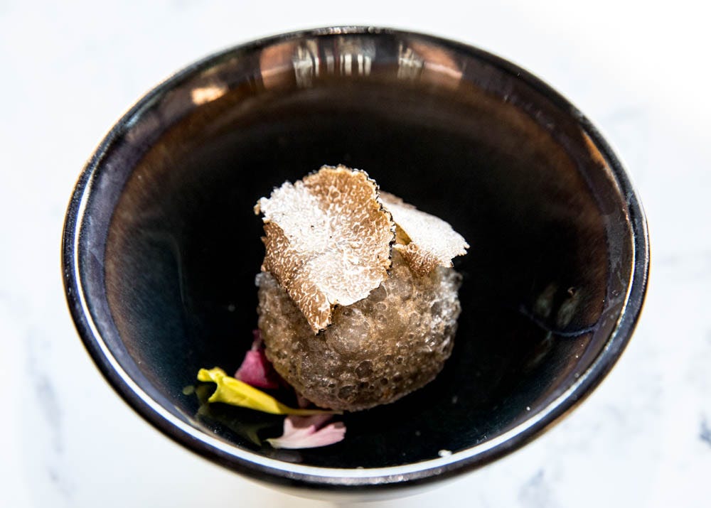 A summer truffle “puff” filled with shimeji dried shiitake mushrooms had a mochi-esque, umami comfort and ash-gray-black color. A fried tiger prawn over a square of watermelon is coated in sesame sauce and peanuts, tasting like an elevated twist on General Tso’s with the kind of peanut-buttery-goodness and vibrant punch of flavor found at old school SF Chinatown classic, House of Nanking. Ditto on the intense kick of sweet chili sauce over New England lobster. I found little touches of whimsy — like black seeds placed as eyes on fish-shaped shrimp and squid dumplings.