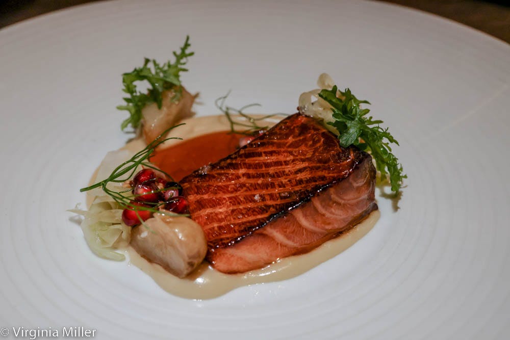 Our gracious server, Monte Har, made us feel at home, as did wine director/sommelier, José Delgado, alongside a team of assistant sommeliers (Montassar Harhouri and Salvador Ramos) and guest sommeliers. Delgado immediately brought out 2021 Hammerling Massa Vineyard “Always for Pleasure” sparkling Chenin Blanc (with 15% Chardonnay) from Carmel Valley to pair with our amuse bouche. Its vibrant stone fruit, pear and citrus notes were elegant and youthful. Delgado has visited the winery and has relationships with the winemakers, as he did with more than a few wines he poured.