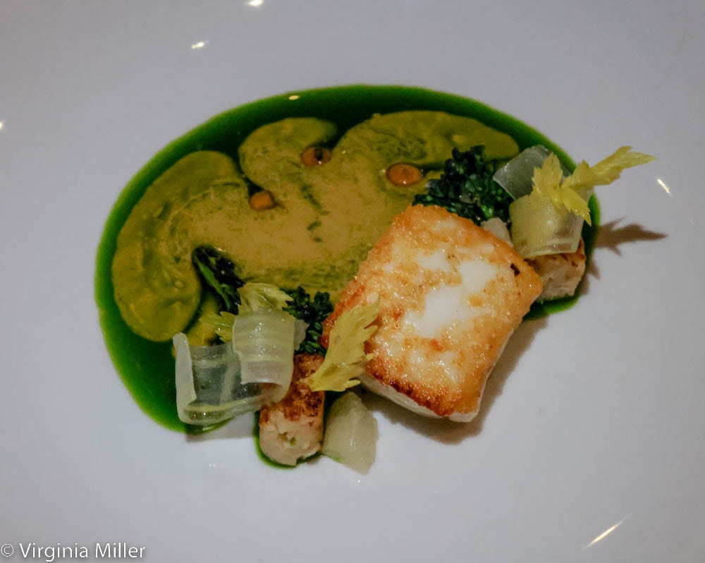 It’s easy to rave about these three courses and breeze over entrees, which likewise are inspiring mashups of flavor, starting with halibut marked by celery slivers, broccoli di ciccio and a whisper of spicy zhug (green Yemenite hot sauce), swimming in a lush oro blanco and mussel emulsion sauce, paired with 2017 Il Carpino Vis Uvae Ramato Pinot Grigio from Venezia Guilia, Italy.