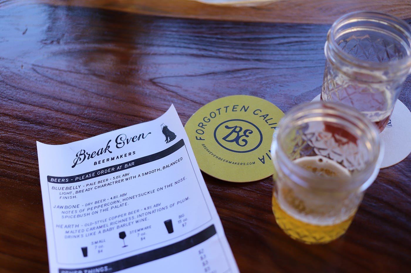 Relocate to Break Even Beermakers. It’s a taproom in an old wooden tavern at the top of the two-block hill. There you’ll appreciate beers that are uncommon to the Bay Area palate: Jawbone, which is a dry peppercorn beer, and Hearth, a malted caramel beer made with old-style copper. They also offer Bluebelly, a light pale beer with a smooth, bready sweetness. And you guessed it, you can get a free (and generously poured) tasting.
