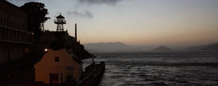 The walk up to the actual prison was haunted, for me, by an earthly menace: standing next to a very loud man cracking jokes over the tour guide, whose canned spiel was itself irritating. As we passed by the prison morgue, I felt a chill, and then had to walk very fast to avoid more of loud guy’s monologue about how awesome it would be to throw a party in the prison. Ugh. Luckily, Alcatraz requires everyone to take a self-guided audio tour. After queuing up in the shower area, we walked through the doorway into the prison itself. It was now dark outside. As I slipped on my headset, I was distracted by a racket above. Cell doors were opening and closing above me, seemingly automatically. The place was definitely creepy.