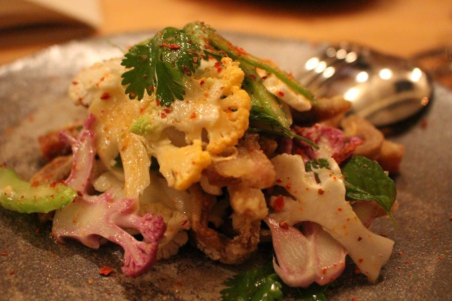 Now let’s talk about pig fries. Pig. Fries. They look like crispy fast food standards, but instead of potato are made of pig ear, pork belly, and guanciale (pork jowl). They hide naughtily under razor-thin strips of cauliflower and herbs, and are probably the product of stoned dreams. It was one of several creative meat dishes seen last night.