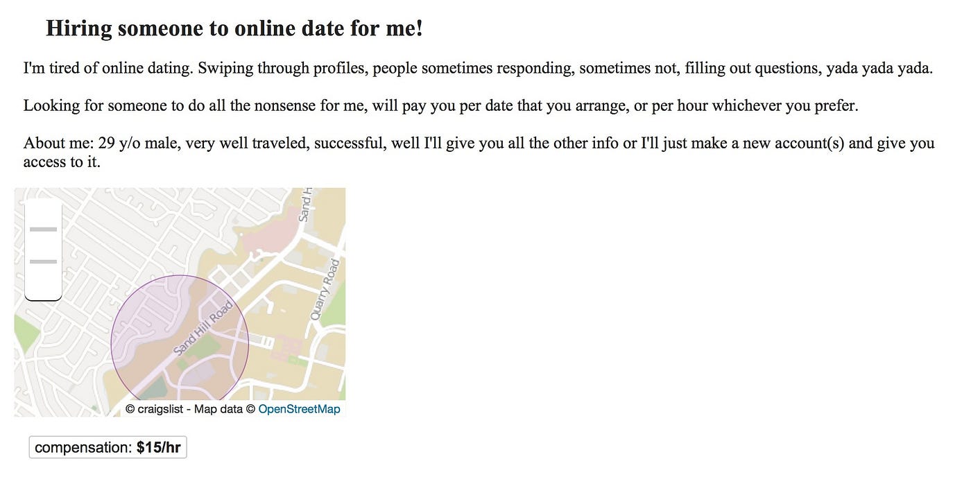What: This is it, folks — the dead end of outsourcing. The Sims, it turns out, wasn’t a game, but an omen. Some 29-year-old guy in Palo Alto is tired of all the “work” of dating. So you get paid to do it all for him — pretend to be him, swipe through dates for him, message and flirt as him and so on. Paid on commission or hourly (your preference).