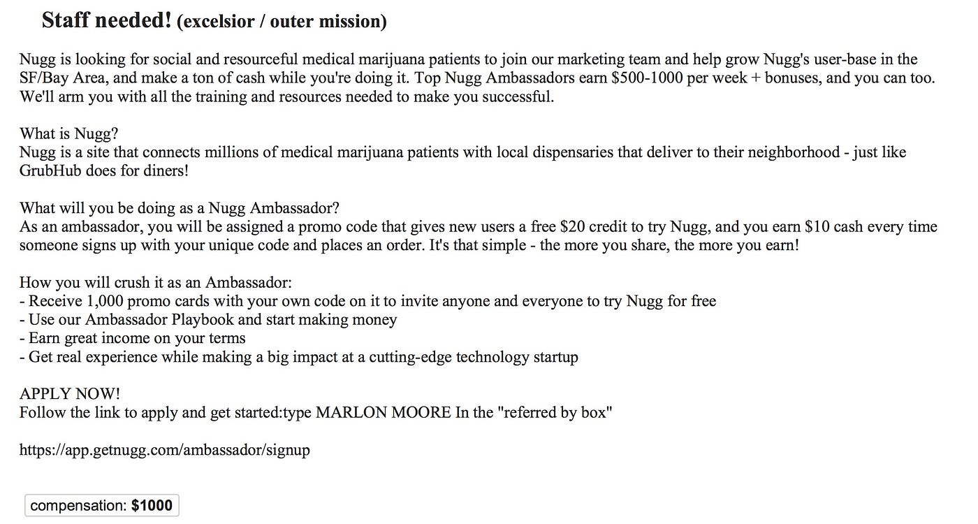 What: Be the brand ambassador of a medical-marijuana dispensary and delivery service. Ask potential buyers to “try” your product (the first one’s free), and earn cash when someone signs up for more. Wait … how is this different from regular drug dealing?
