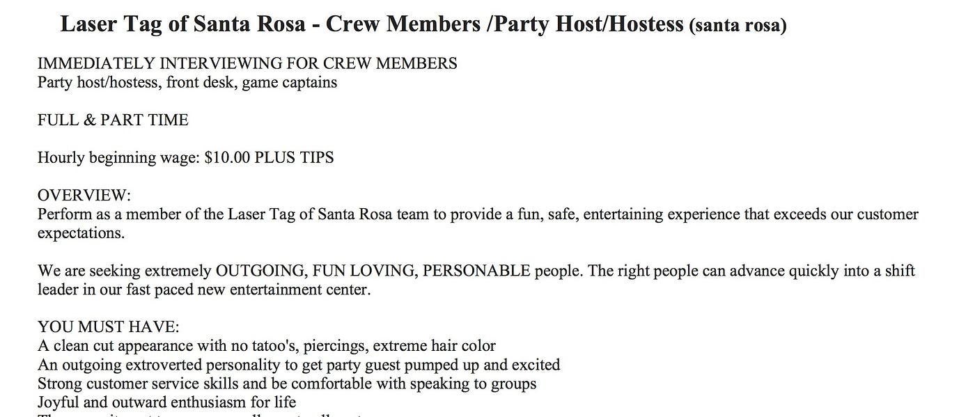 The Bad: It pays only $10/hour. Also, the ad clearly states that applicants must have “a clean-cut appearance with no tatoo’s [sic], piercings, extreme hair color.” That rules out just about every Bay Area Millennial.