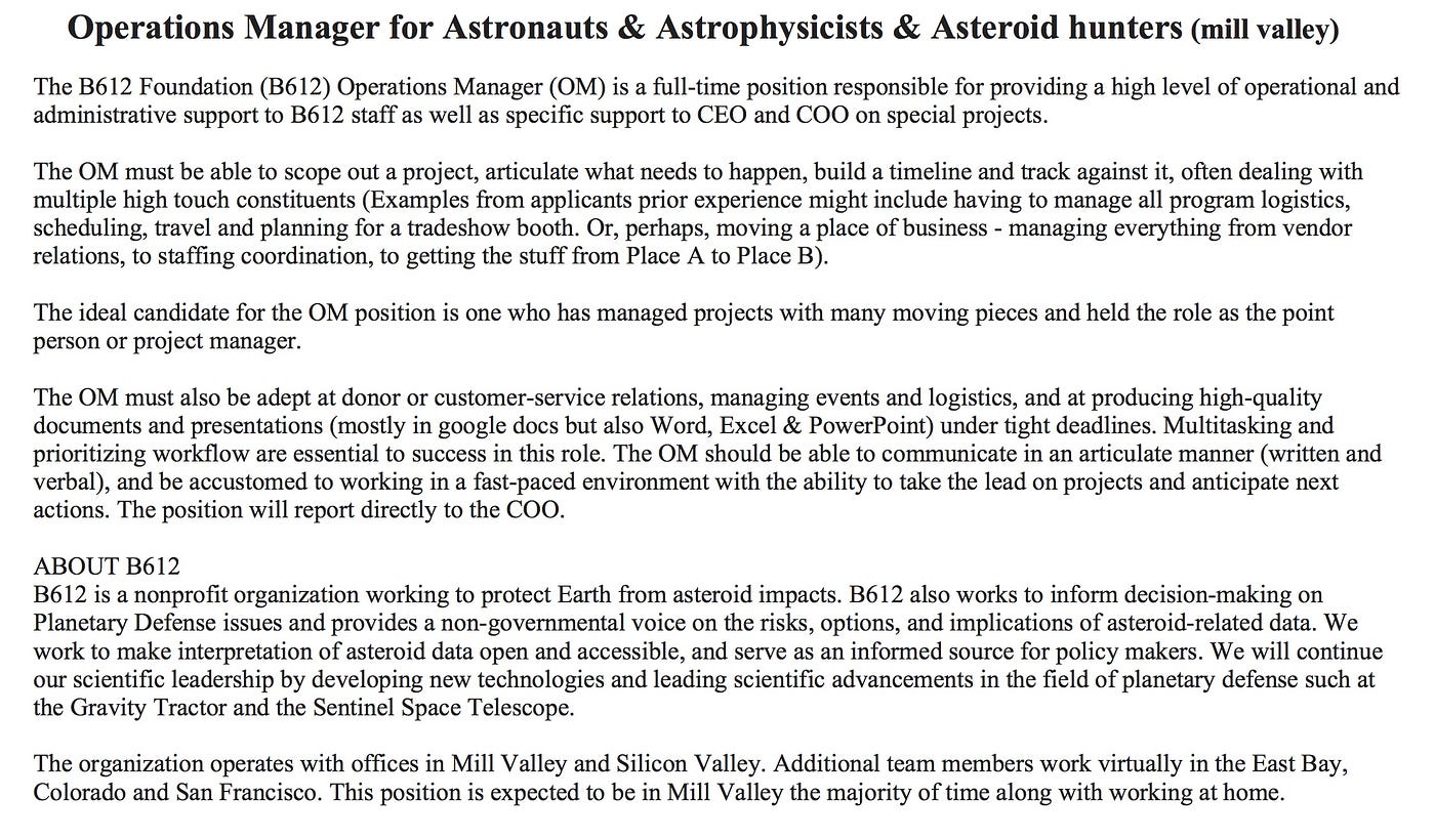 What: A nonprofit in Sausalito that finds Earth-threatening asteroids so that we can send Bruce Willis’s drilling team into space to blow them up and save the world.