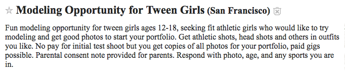 What: Someone wants to take pictures of preteen girls. And not pay them.