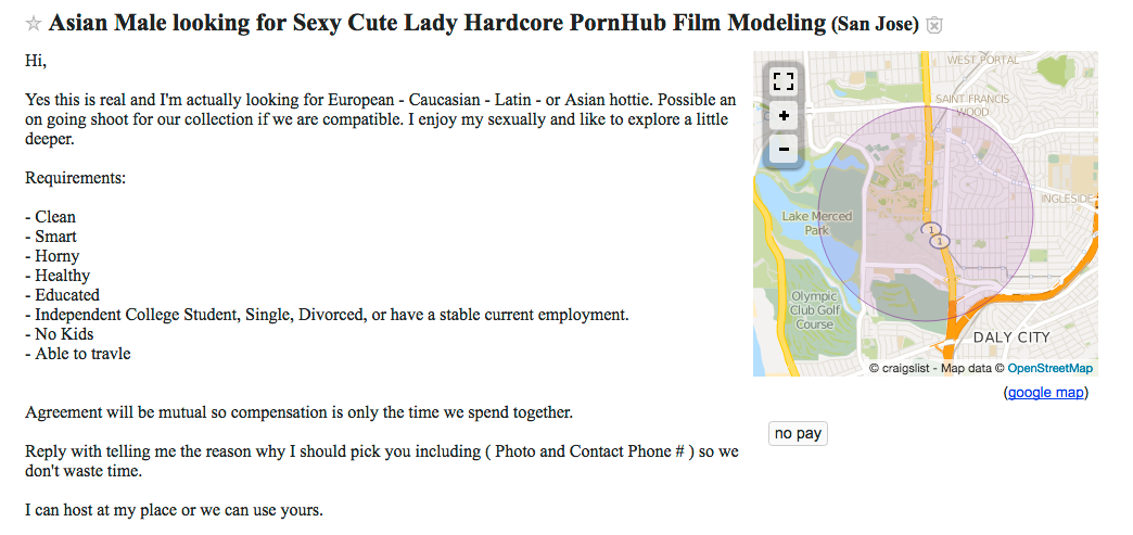 What: An Asian dude in San Jose is looking for a girl to make porno films with him that he will then put on PornHub.