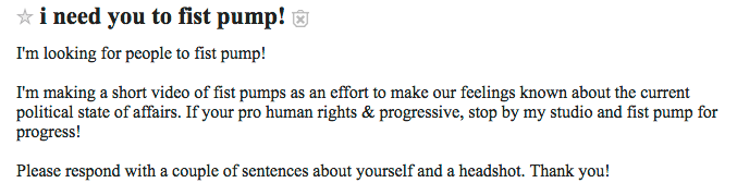 What: A filmmaker wants to film you fist-pumping to protest “the current political state of affairs.”