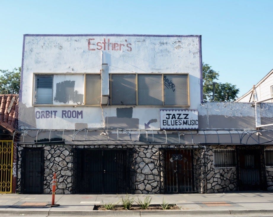 Eventually, in 1962, Slim Jenkins was razed, and Esther’s Orbit Room — a once-thriving jazz club — became a small, neighborhood dive bar lovingly known as “the Grand Lady of Seventh Street.” It officially closed its doors in 2010, and the owner, Esther Mabry, who bought the building with her husband in 1959, died shortly afterward at the age of 90.