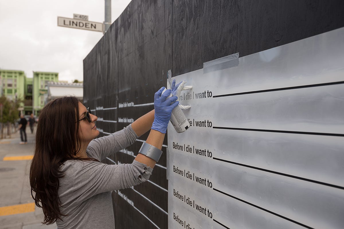 If you’ve found yourself in Hayes Valley over the past couple days you may have been curious about the large black wall on the corner of Octavia and Linden Streets. Wonder no more — the wall is part of a global community art project conceived by Candy Chang called Before I Die, where anyone walking by it can pick up a piece of chalk and fill in the blank after the phrase “Before I die I want to… .” The project is a chance for people to take a moment and share their reflections about their lives with the community around them. Candy has taken Before I Die to more than 70 countries, and translated it in 35 languages.