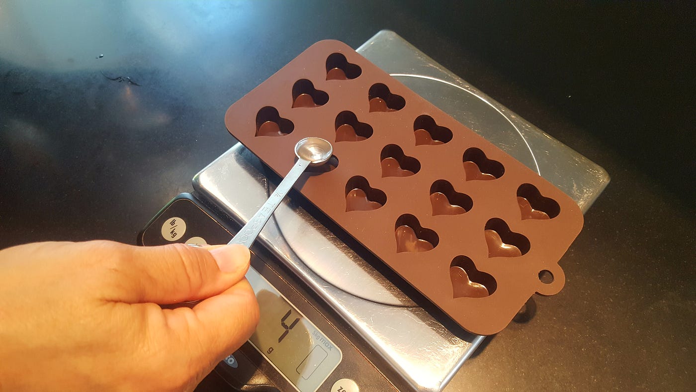 So we decided we wanted our suppositories to contain a 1:1 ratio of CBD to THC at a maximum dose of 5 mg each. That meant we had to determine the amount of CBD in one full dose of CBD oil, then add enough doses to our entire batch of cocoa butter to yield 5 mg of CBD per heart.
