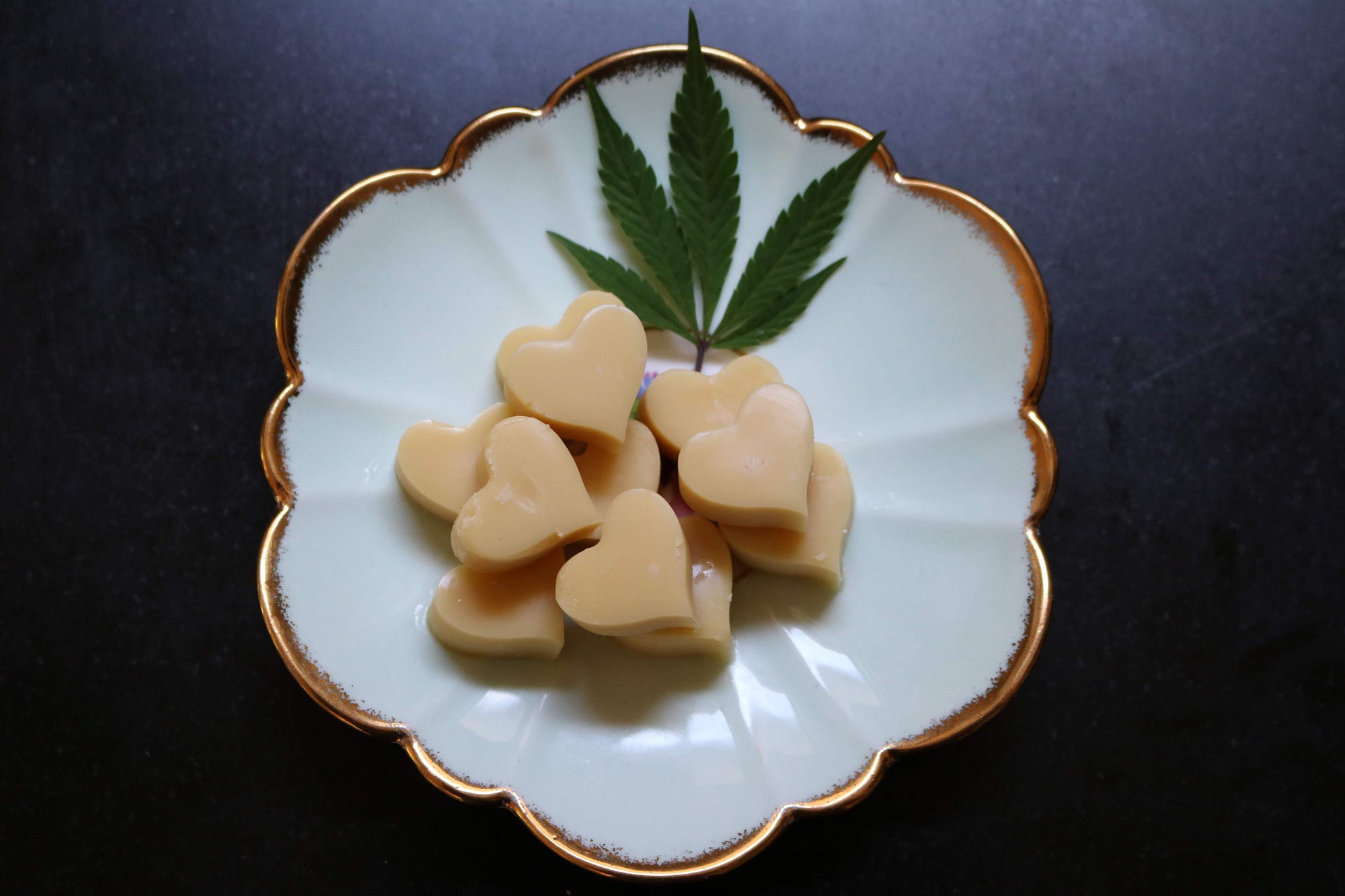I had a 500 mg bottle of Pure Bloom Full Spectrum CBD Oil, which I’d received as a press sample, and one gram of THC-rich Antidote Strawberry Banana Sauce, which I’d purchased on a whim. I even maneuvered the real-world fever dream that is Michael’s (seriously, that place is my worst nightmare) and passed over unicorn and star shapes to select a heart-candy mold that was perfect for our project.
