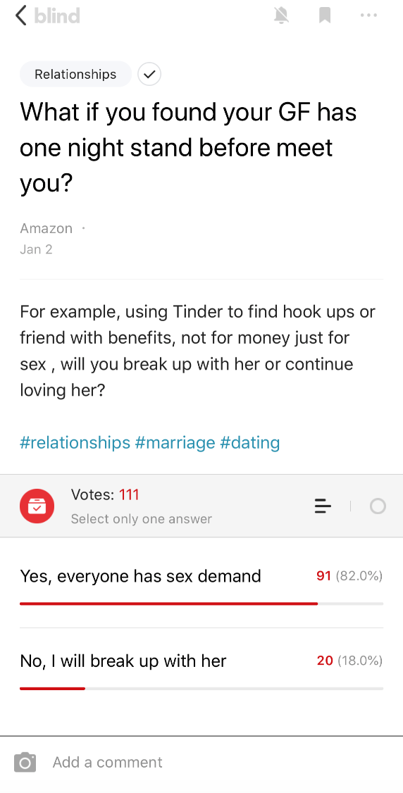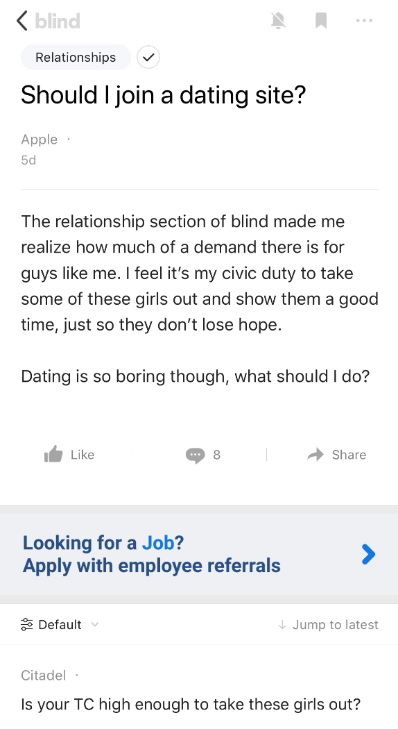 Dating in Silicon Valley is a hot topic and official tag on Blind. Noticeably, posts about relationships, which have nothing to do with careers, tend to have the user’s total compensation (TC) listed at the bottom and if not, there will be constant requests in the comment section for “TC or GTFO” (total compensation or get the fuck out). This demonstrates how critical salary is to how people are viewed by the Blind community. Those who have a high TC are revered; those with a lower salary need to make a change, stat.