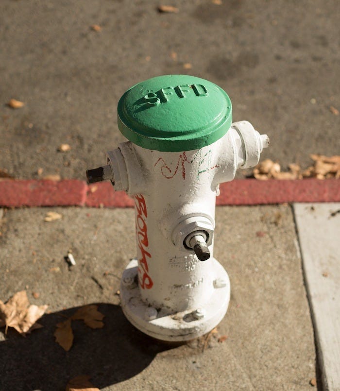 The 30’ markers are hard to miss when you’re driving over them, but a lot of people never bother to think about their actual purpose. They’re scattered around the city in a fairly lopsided arrangement, loosely correlating to the most densely built areas. The greatest concentration of cisterns can be found in the Financial District, with 31 in just a half mile radius, while the entirety of the Sunset boasts a grand total of seven. The Outer Richmond, in classically pointless San Francisco form, has squares instead of circles. Some of them don’t have any bricks at all, but you can tell there’s one nearby if you see a hydrant with a green cap.