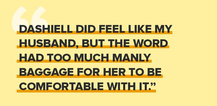 Dashiell did feel like my husband, but the word had too much manly baggage for her to be comfortable with it. There was “spouse,” a word from government forms that reminded me of the tiny plastic pegs in the Game of Life board game. “Partner” had been so absorbed by hetero liberals that saying it suggested I was married to a stay-at-home dad who campaigned for Green Party candidates and had a feminist blog. Plus, the roots of “partner” are in the bullshit domestic partner option homophobe politicians once pushed for in lieu of actual marriage. Plus, its neutrality sounded neutered to me — blah, bland, redolent of linty, sexless marriages.