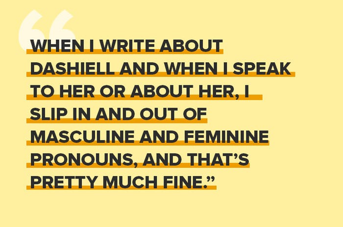 The question of what to call my totally masculine female partner (partner — ech!) had begun surfacing a month before our wedding. My sister had inquired about what her children, my fiancée’s future niece and nephew, should call Dashiell after we were hitched. I was “Auntie Michelle” and my sister did her best to enforce the formality, having sweet memories of our own aunties. I knew Dashiell wouldn’t be an auntie. Her hair is military-short and blocky men’s eyeglasses sit on her angular face. She leaves for work each morning in a button-down, sometimes a tie, sometimes not. Always men’s pants, and wingtips, a cardigan. She looks like a guy — like a superhot male model, and I often accompany her into the ladies’ room, ready to put out any “man in the ladies room!” fires that her presence might spark. Female titles feel so wrong with Dashiell, and pronouns are confusing — I often find myself calling her “he” without meaning to. She doesn’t mind. It doesn’t fit her perfectly, but neither does “she.” Like so many people whose bodies, minds, and aesthetics exist in between our two-party gender system, her current options suck. While there is a real effort among genderqueers to institute the unisex pronouns ze and hir, they sound a little too sci-fi for us. Other androgynes opt for the gender-neutral “they,” which does the trick but also suggests multiple personalities. When I write about Dashiell and when I speak to her or about her, I slip in and out of masculine and feminine pronouns, and that’s pretty much fine.