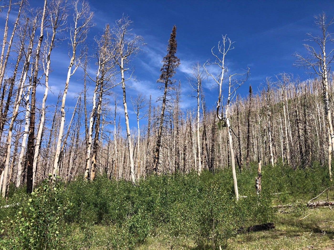 The handful of untouched aspens — a solitary survivor here, a row of several there — have tossed down new life, seeding a resurgence of saplings that seek dominance in whatever forest of the future might develop. Aspens are crafty, even sprouting new post-fire growth directly from their roots. Their reemergence is impressive.
