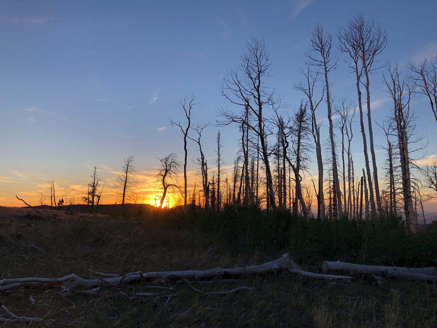 Sunset brings color to the standing corpses, orange and red reflections off bare white bones. Soon the dead aspen is black silhouettes against fading twilight. I remain baffled by the physics of screaming dead trees in this ravaged, beautiful, sad, and hopeful former and future forest. But I have a good idea of what they were trying to say.