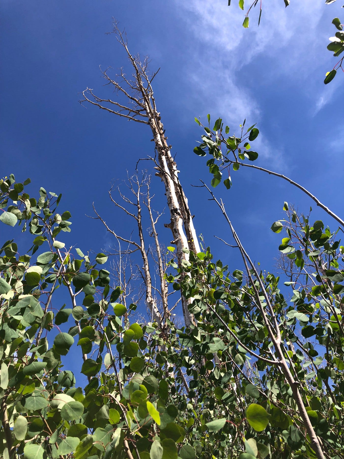 Where once a grove of majestic aspens stood, their paper-thin leaves whispering at the slightest summer breeze and shouting the passage of any strong gust, now mostly denuded white and black corpses reach hopelessly skyward, pitifully thin arms outstretched, weakened trunks poised for an inevitable toppling.