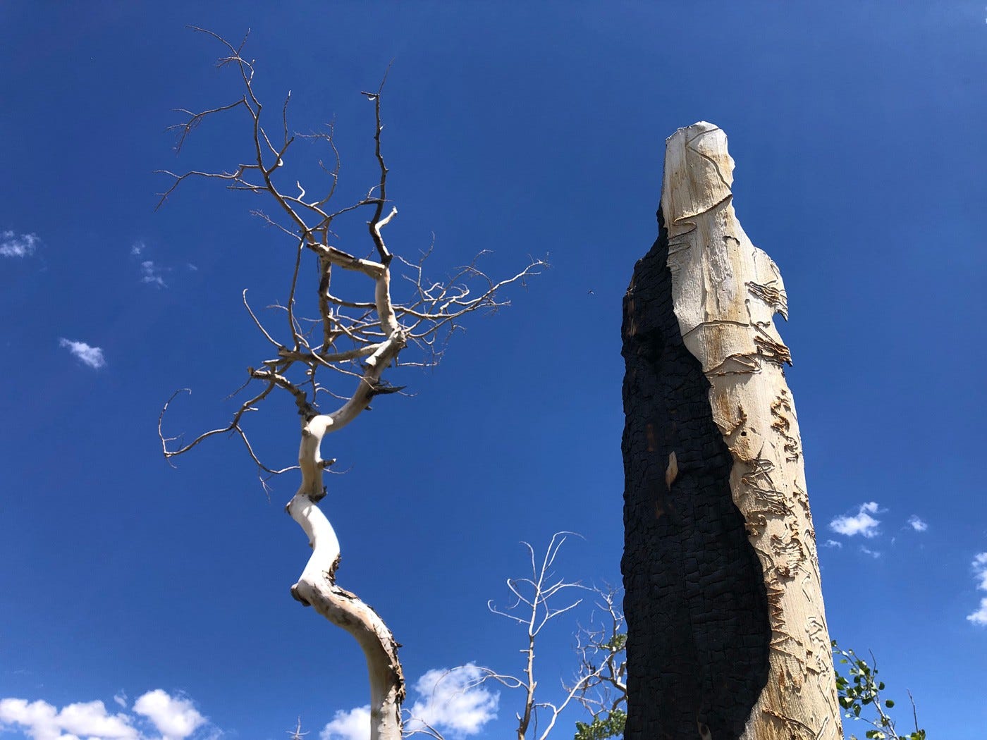 All around this high-mountain meadow at midday, a handful of improbably untouched aspens remain, shivering and quaking amid their charred deciduous neighbors, alongside a few brown, scraggly conifer carcasses.