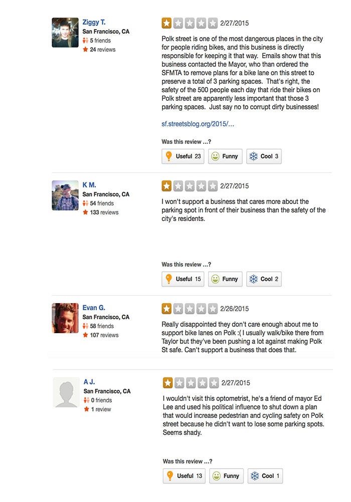 Say what you will about the merits of guerrilla Yelp warfare and the possibilities of blowback against the safer streets cause, at least the pro-bike lane people aren’t using profanity, all caps, or lots of exclamation marks to make their point. (Note that three of the four critics are frequent Yelpers who didn’t just join to trash this one business).