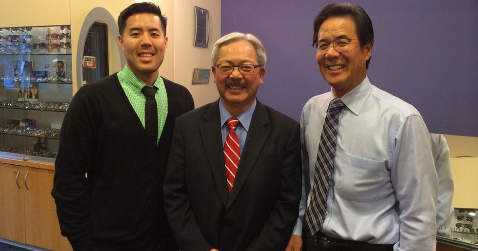 If you think the saga to extend bike lanes on Polk Street is like pulling teeth, it might be more accurate to say it’s like flushing a scratched cornea. When Dr. Ronald Hiura (pictured above on the far right), an optometrist on Polk and a friend of Mayor Lee, lobbied to nix a block-long section of raised bike lane outside his office, people started flipping out.