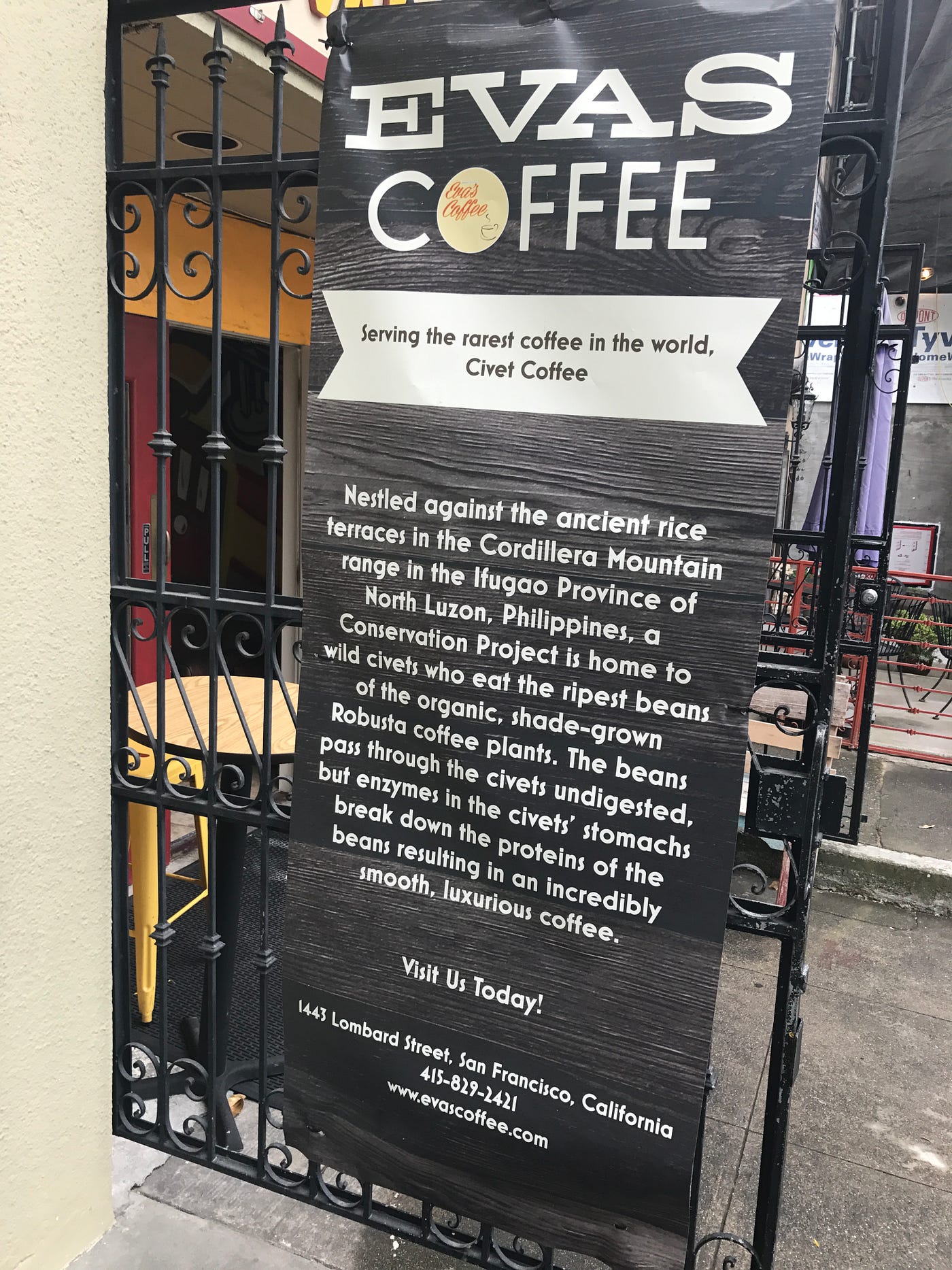 Eva’s Coffee on Lombard Street in San Francisco sells a cup of coffee brewed from beans that have passed through the anus of a small Asian marsupial for $15.
