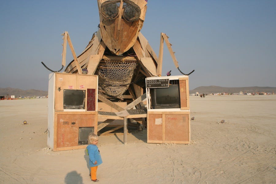 As someone who can barely manage parenting in a city with every amenity at my fingertips, I can’t imagine taking my child to the desert for anything, much less a weeklong art party. When you throw in the fact that my kid bursts into tears at the sight of the Robot Dance Party dude, the deal is sealed: We are never going to be a Burner Family. Nonetheless, there is a large contingent of people who brave dust storms, exposure to public sex acts, and possible dehydration with their kids at Black Rock City in Nevada each year in the name of art. Or partying.