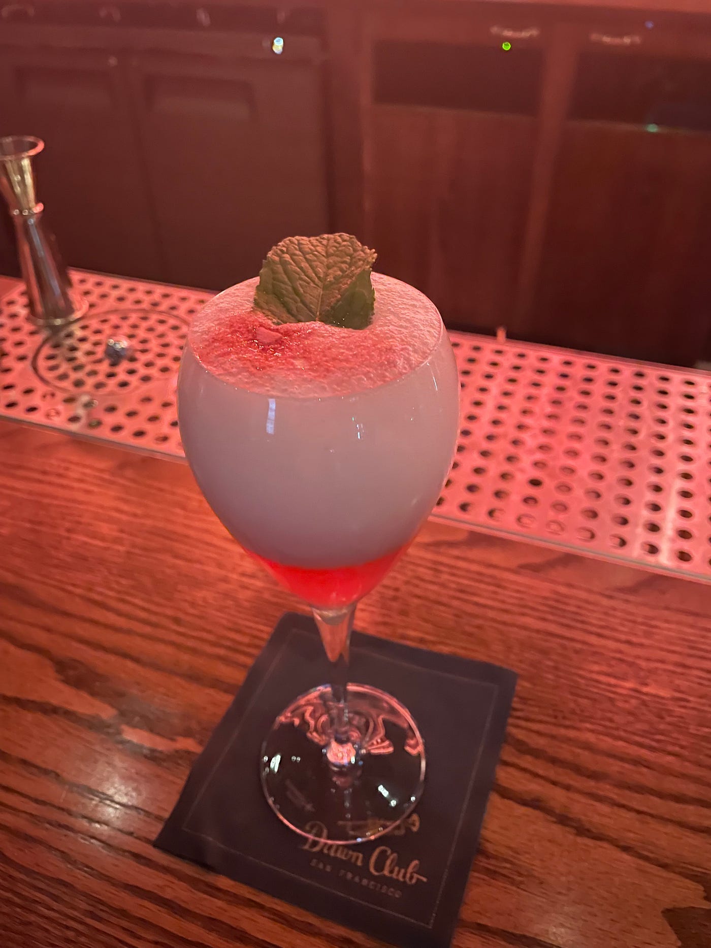 He calls these rare old bottles his “rainy day fund,” and is extremely pleased that he’s finally got a chance to tap into it here at Dawn Club. Those bottles of hundred-dollar-plus pours are hidden behind the handcrafted hanging bar’s glasswork’s ember-bright streaks, out of sight but definitely not out of mind.