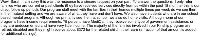 Tobey, a teacher from Oakland, demanded to know how the families were vetted. “How do you know they’re actually poor?” he pushed. I told him I was in Teach for America and taught for several years afterward. I never once thought that the “free” food I’d sent home with my students on Fridays was going to a family of scammers. WTF, Tobey? He responded, “I have students who show up without school supplies and own an iPhone 6.”