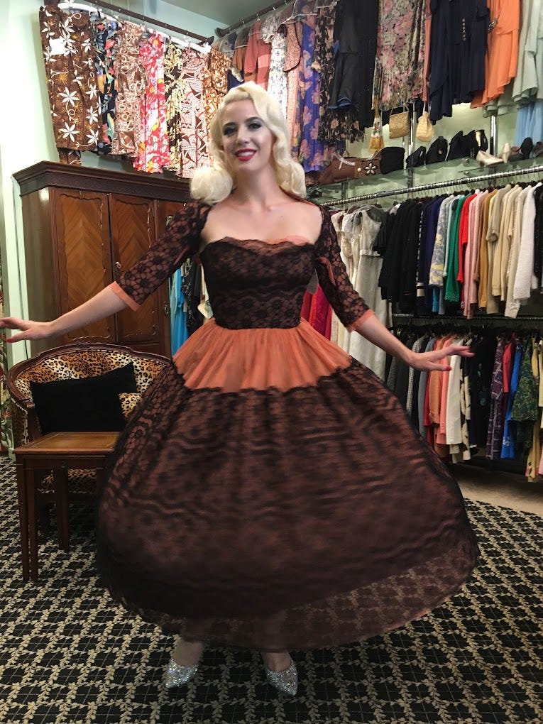 Relic Vintage is an upscale shop specializing in American-made vintage. Their focus is on pristine pieces from the 1940s-1960s, often showcasing beautiful fabrics, sophisticated sewing techniques, and fine detailing. I love the cohesive curatorial eye behind this store, especially around mid-century dresses, skirts, beaded sweaters, hats, and jewelry.