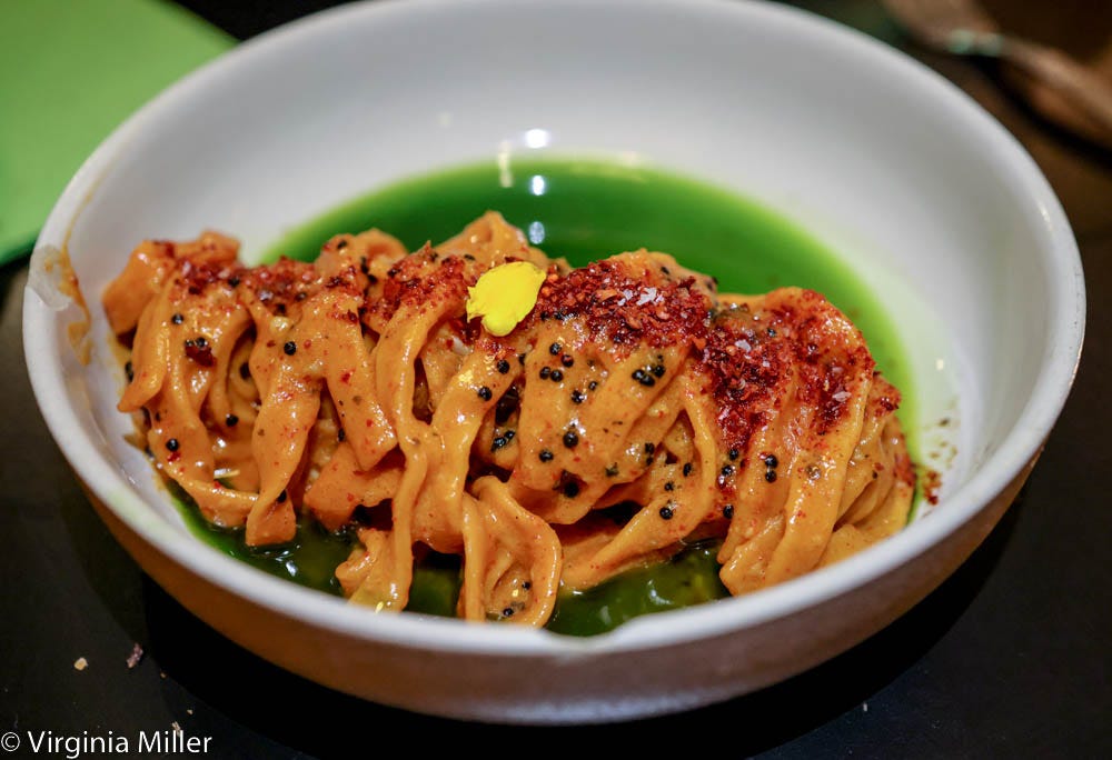 Three squares of fried pork rillettes in pork jus-laced mashed escabeche Riverdog carrots, watercress and slivers of red carrots, felt the most “traditional” or straightforward, though well executed and comforting. Another hit since Daytrip’s early days is that dreamy miso butter pasta. On our visit, the chewy pasta was lush in local Shared Cultures miso marked by morel mushrooms, dotted with kelp pearls, gochugaru (Korean chili pepper flakes) and Turkish marash chilies.
