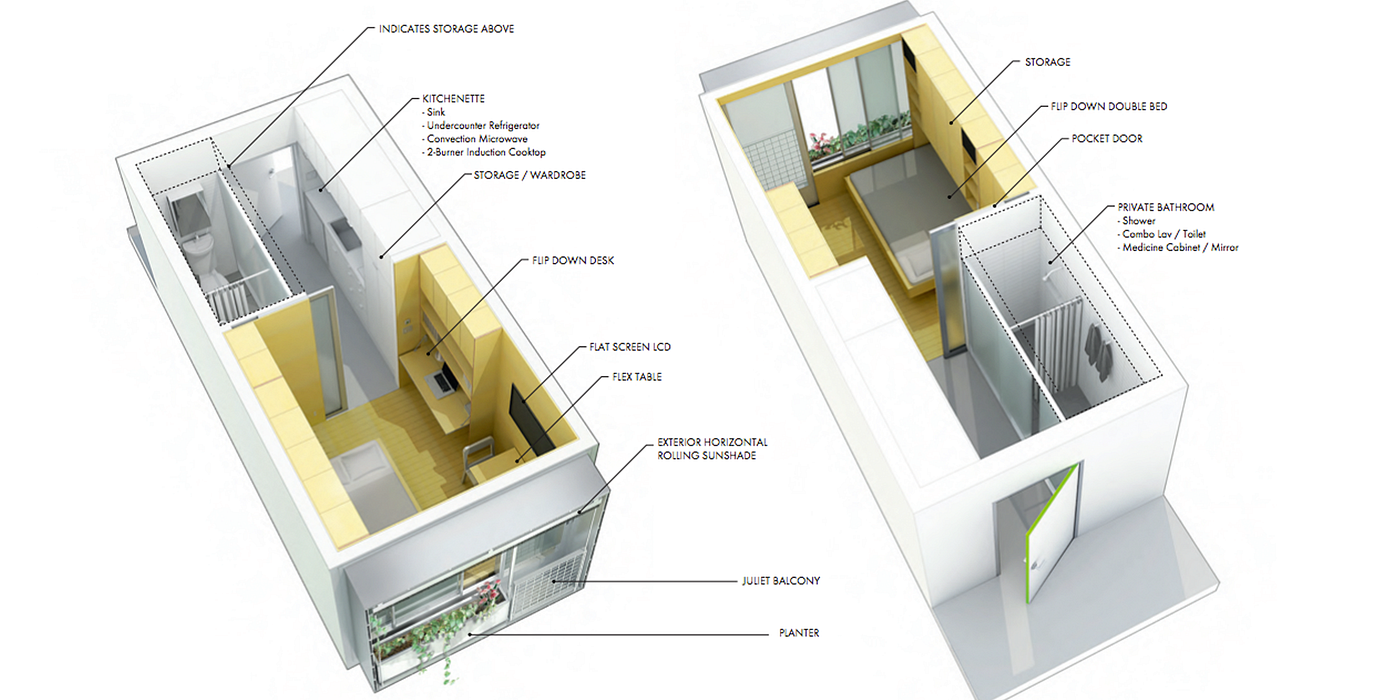 Somehow these tiny living spaces will cram a “full bathroom, kitchenette, wardrobe, ‘flex table,’ and flip-down double bed, not to mention Juliet balconies and planters for a bit of green.” I guess San Francisco will see the return of the Murphy bed, which apparently was invented in the city in the early 1900s by a guy living in a one-room apartment who was trying to woo an opera singer into his place without seeming like a total skeez.