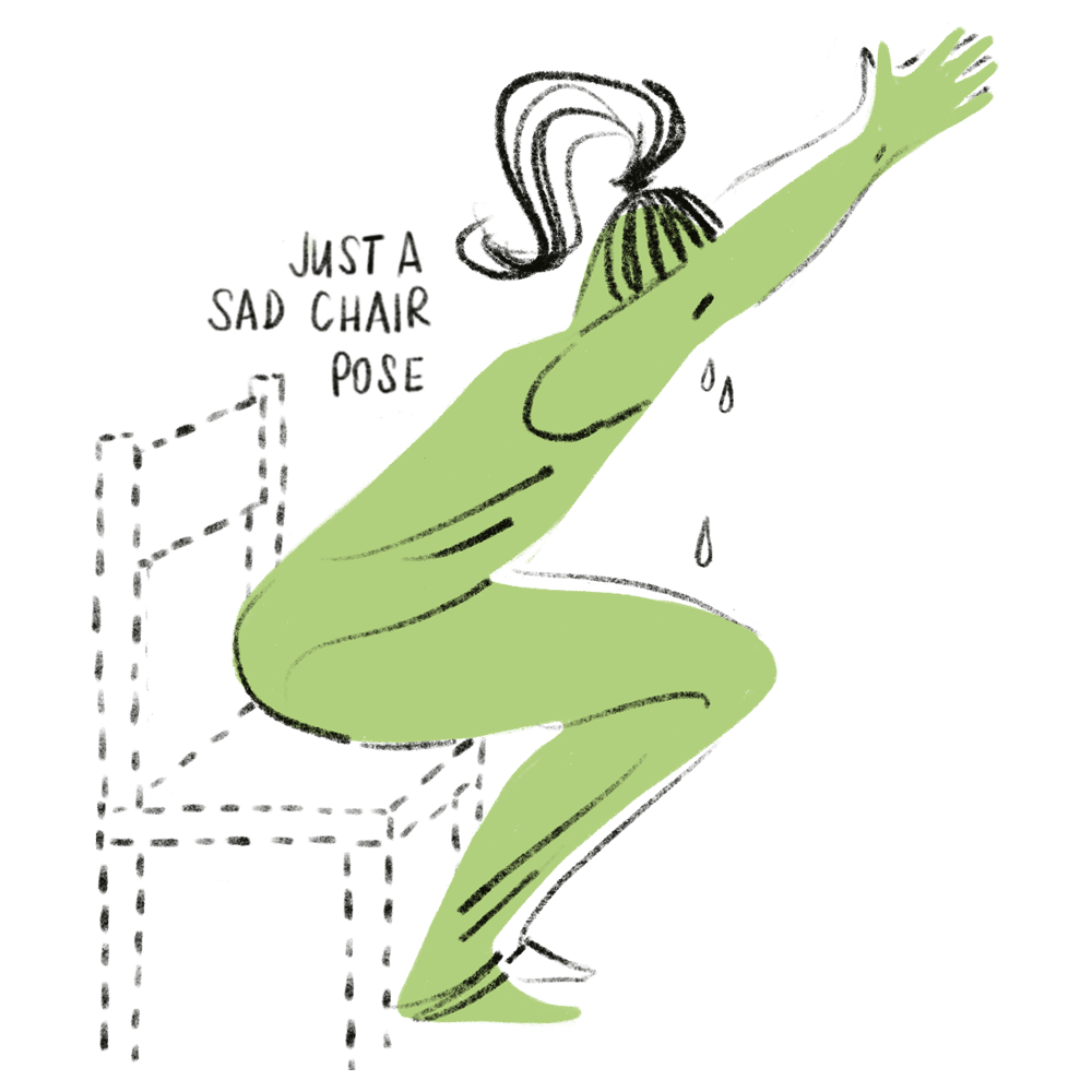 Exhale and bend your knees. Try to make your thighs parallel to the floor. You know, parallel. As in, the parallel life you’re living that’s 30% to 40% worse than the one you could be living if Elliot hadn’t dumped you three years ago.